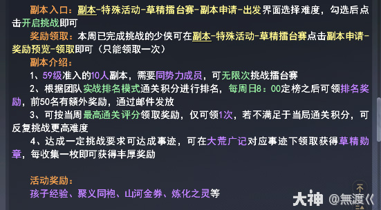 (1)普通打法,副本秘境-特殊活动-草精擂台赛-副本申请-出发后勾选带红框的技能(目前大部分的团都是18关,30分钟内打完是满奖励)-开启挑战,模拟训练模式-申请训练