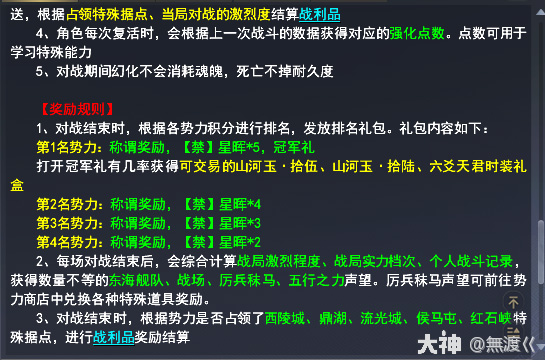 特别标注一下:山河策战场中幻化和合体不消耗魂魄,所以有幻化和合体的无限起就行!奖励除了普通排名外,还有五个大点的特殊奖励(西陵城,鼎湖,流光城,侯马屯,红石峡)
