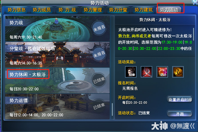 势力官员可以在势力活动中自定义时间段开启时间段,目前可设置的时间段为17:30-19:00、19:00-20:30、20:30-22:00、22:00-23:30,充分满足大家的泡澡需求!不过“太极浴”开启时间段每周仅可修改一次,每天没来得及泡澡的可以第二天点击“奖励补领去领取声望”。