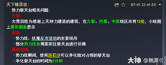 主要就是抢占(净化)祭天台,需提前购买浣石沙(找势力战商人寇罗伊购买,每个1金,可以交易,禁交易金币购买的则不可以交易),净化祭天台中途可以被打断,如洗了对应祭天台的祭天旗,则净化祭天台的时间缩短为4分钟。(如图3)