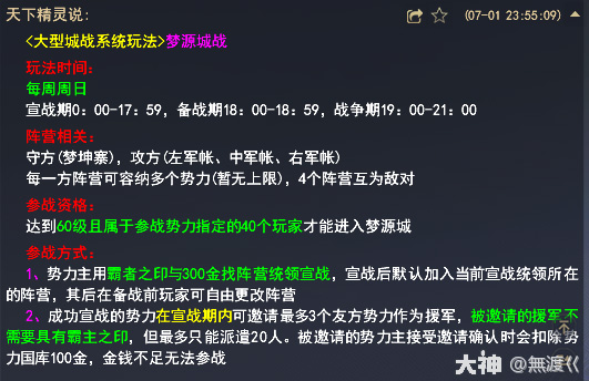 每周六19:30前,势力管理需通过势力界面-势力战-参加势力战报名,普通势力成员只要所在势力报名势力战,周六晚19:30自动加入势力战